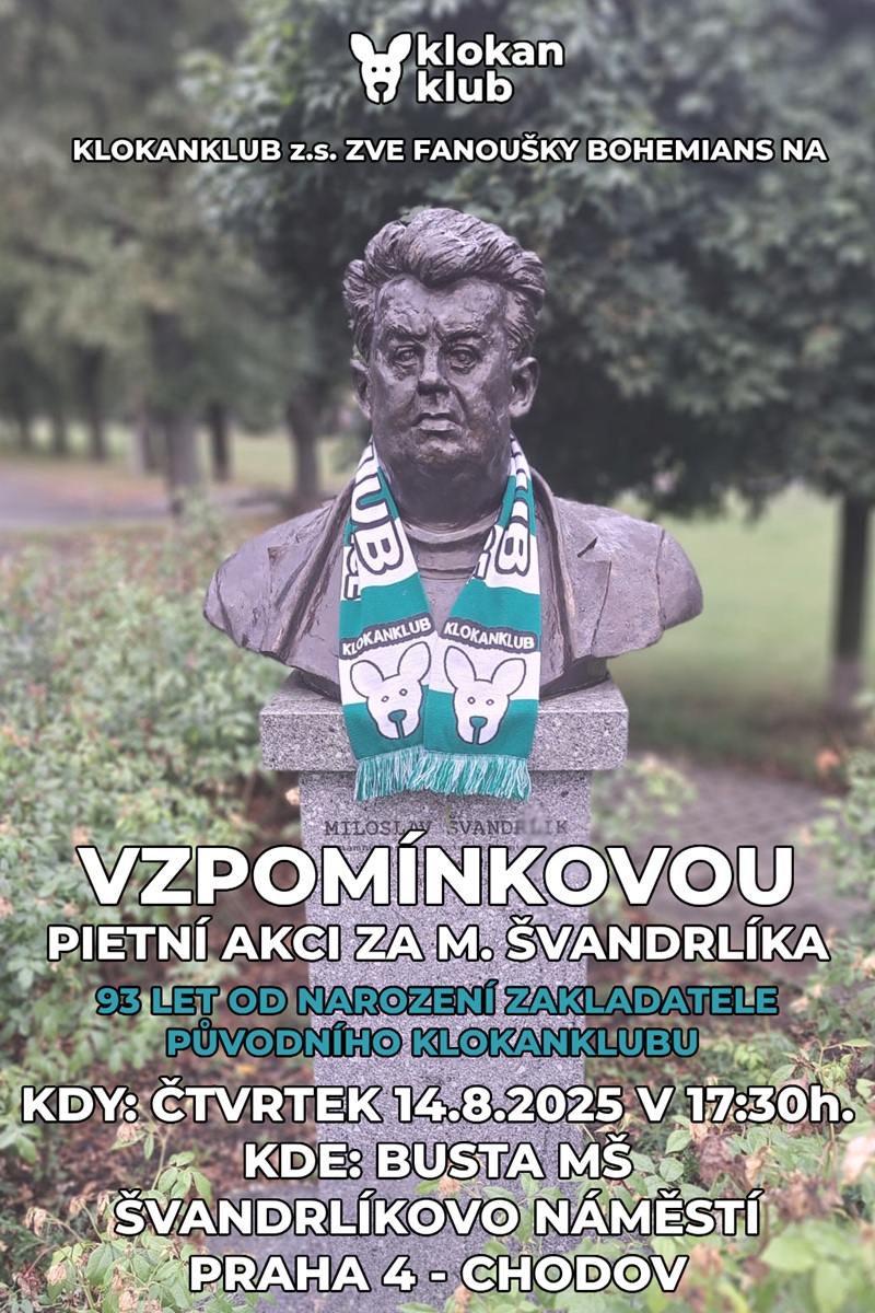 Projev předsedy Klokanklubu z.s.: Dámy a pánové, vážení a milí přátelé Bohemky a Klokanklubu! Již počtvrté se zde scházíme, na Starém Chodově, abychom oslavili 93 let od narození pana Miloslava Švandrlíka. Humoristy a chodovského patriota, který se význačnou měrou zasloužil v 60. letech minulého století o založení původního Klokanklubu – spolku příznivců při tělovýchovné jednotě Bohemians. Švandrlík patří dodnes k nejčtenějším českým autorům a jeho spojení s výtvarníkem Jiřím Winterem Nepraktou přineslo příznivcům humoru několik tisíc kreslených vtipů publikovaných převážně v časopisu Dikobraz. Jistě si vzpomenete např. na několik knih o dvou žácích Kopytovi a Mňoukovi nebo majorovi Haluškovi řečeném Terazky… Jse velice rád, že náš fanklub získal licenční právo na použití ilustrace od Jiřího Wintera Neprakty, která se objevila na první členské legitimaci původního Klokanklubu! Spolek Klokanklub, který vznikl na začátku roku 2022 a navazuje na činnost původního Klokanklubu letos obnovil členství jako oficiální pobočka fanklubu v rámci Zelenobílé republiky. Právě v jubilejním roce, kdy fanoušci zelenobílých barev slaví 120. výročí vzniku Bohemians. Poněvadž se dneska jedná o pietní akci, chtěl bych také vzpomenout nejenom na mistra Švandrlíka, ale také na pana Viktorína Šulce a legendárního fotbalistu Pavla Chaloupku. Spisovatel detektivek, novinář, scénárista a hlavně velký fanoušek Bohemians nás opustil na konci ledna tohoto roku. Na konci května nás pak šokovala zpráva o úmrtí československého reprezentanta a člena mistrovského týmu Bohemians! V listopadu roku 2023 jsme se při akci Setkání s klokanem mohli s „Chalupářem“ osobně poznat a o to více nás jeho smrt zasáhla! Jsem rád, že při posledním rozloučení v Chomutově byli přítomni zástupci našeho fanklubu. Dovolte mi prosím, abychom nyní uctili minutou ticha tyto tři borce, kteří se nesmazatelně zapsali do srdcích fanoušků Bohemians. Děkuji.