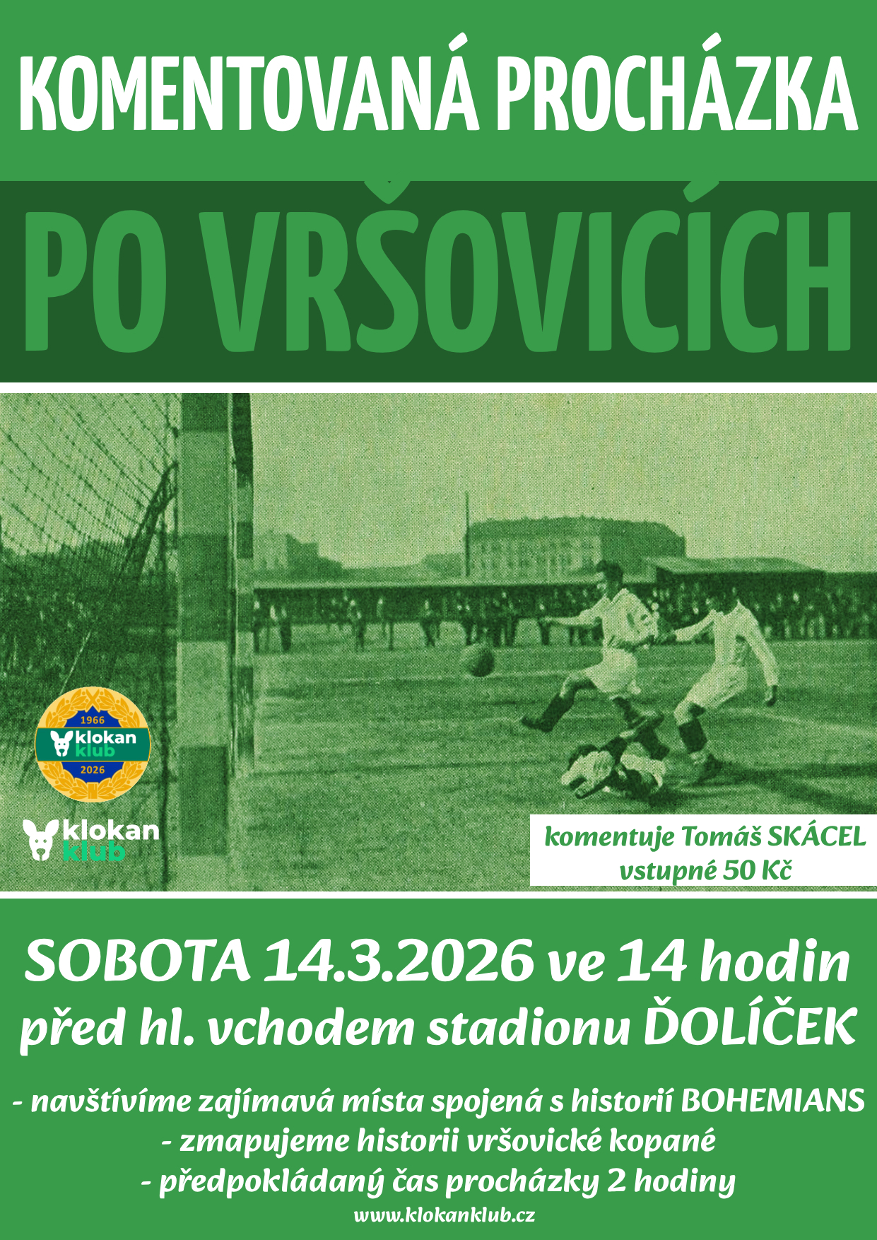 V sobotu 14.3.2026 uspořádala historická sekce komentovanou procházku po Vršovicích zaměřenou na historii vršovické kopané. Sraz byl naplánován ve 14 hodin před naším svatostánkem - Městským stadionem Ďolíček (Dannerův stadion Bohemians). Poněvadž akce měla ze strany klubu Bohemians velké promo (za což moc děkujeme!), procházku si nenechalo ujít na 33 fanoušků nejenom zelenobílých barev! Přivítání obstaral předseda Klokanklubu, které účastníky seznámil s harmonogramem vycházky. Poté se už slova ujal, při krásném slunečném počasí, na téměř 2,5 hodiny historik a skvělý vypravěč Tomáš Skácel.